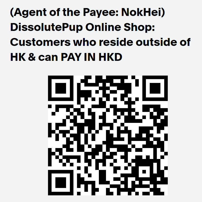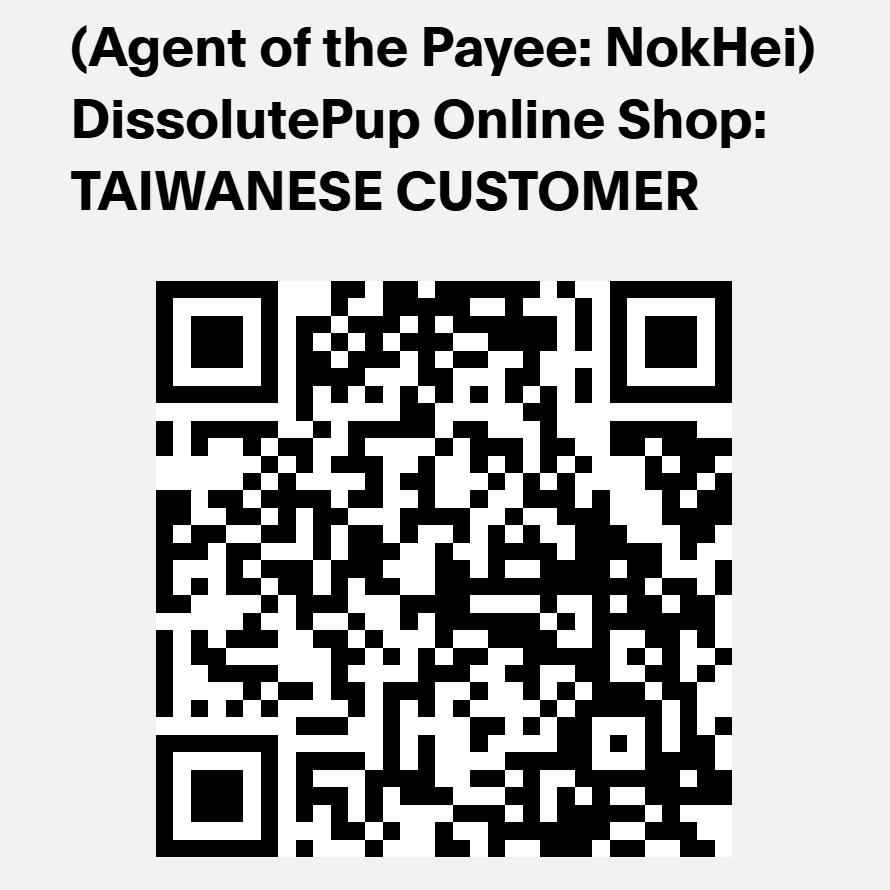 - 當閣下造訪本網店,即同意已詳閱所有有關收款者(payee)與付款者(payer)享有的權利、責任與義務的文件,包括但不限於列於「付款方式」網頁 (https://dissolutepup.com/pay/) 的全部內容,並完全明白、接受、知悉及同意其內容(不論有否轉帳付款)。